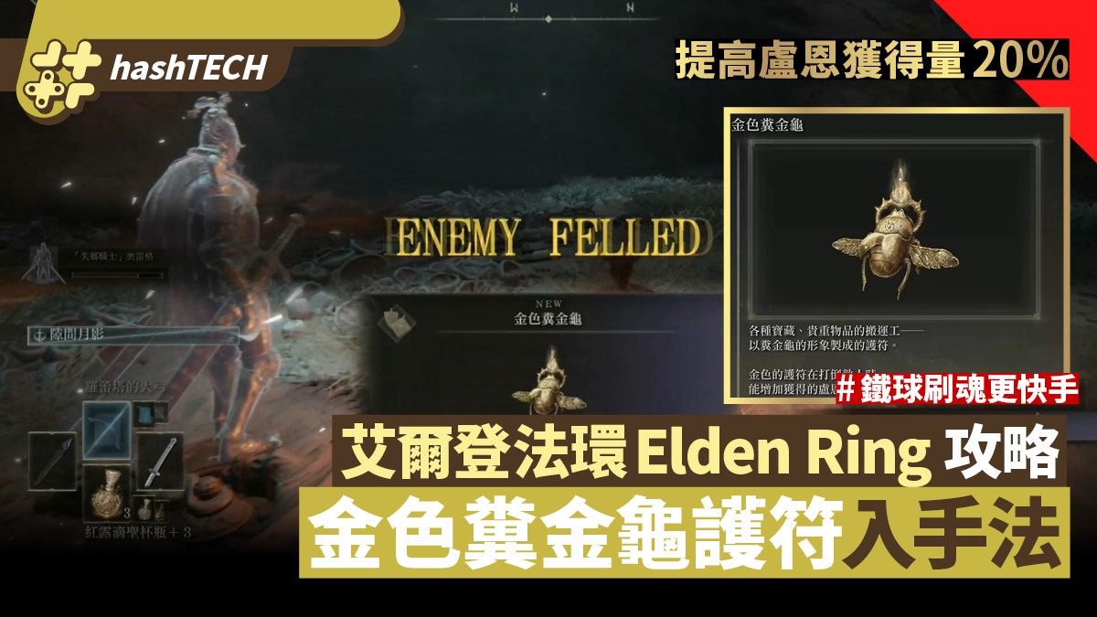 艾爾登法環Elden Ring攻略 金色糞金龜入手法 提高盧恩獲得量20% PS5 / Xbox|《Elden Ring》艾爾登法環已經正式推出,相信機迷們已經急不及待瘋狂煲機了,《香港01》科技玩物頻道亦有艾爾登法環攻略,以下為遊戲超實用護符「金色糞金龜」入手方法,可提升盧恩(錢)獲得量20%。